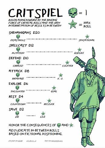Critspiel is a 48-word RPG framework powered by the binding force of critical rolls and the open interpretation of results in between. OSR and FKR sensibilities help, too. Somewhat inspired by the amazing Spoor.